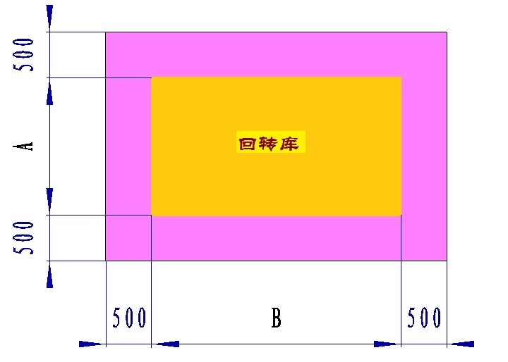 圖中,A,B,分別代表回轉(zhuǎn)庫(kù)的深度和長(zhǎng)度。庫(kù)體(包括周轉(zhuǎn)車部分)周圍500mm距離為方便安裝、拆卸、檢修回轉(zhuǎn)庫(kù)的預(yù)留空間,當(dāng)多臺(tái)回轉(zhuǎn)庫(kù)安裝時(shí),可并排組在一起。